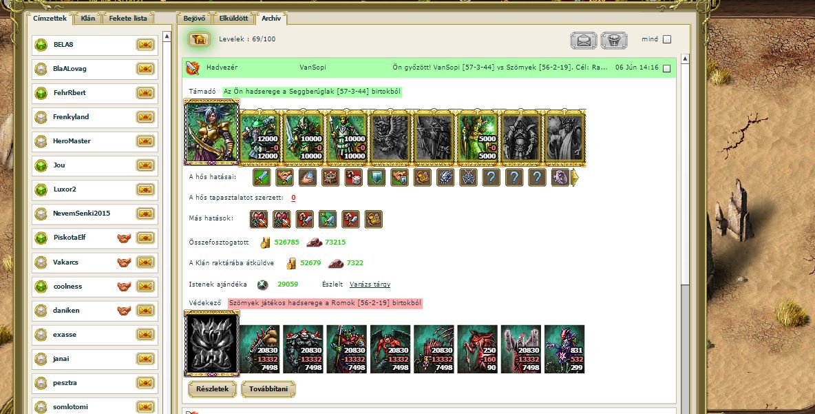 Mindenki halott már a hiresz szörny romról,ami tele van kincsekkel .!.2019 jún 6 napján kutatóim a királyságok felderítésére indulta,jöttek is a általuk szerzet hírek,1,2,3,4 romok és aknákról,egyszer csak felfigyeltem az egyik bátor kutatóm jelentésére,7 szintű főromról tett jelentést!hihetetlen!! gondoltam először ,de a kémeim megerösiteték a kutató jelentését.megszólaltak a harci harsonák!,bátor hősünk és serege felkészült a nagy csatára,tudták hogy itt minden áron győzni kell a gonosz fő rom fölöt! Útnak indult a pár ezer fös sereg ,mindenki izgatotan várta a harc kimenetelét.Nem kellet olyan sokat várni ,jöttek a hirek bátor seregünk gyözelméröl,,,,Köszönöm ...további jó játékot !!Üdv VanSopi