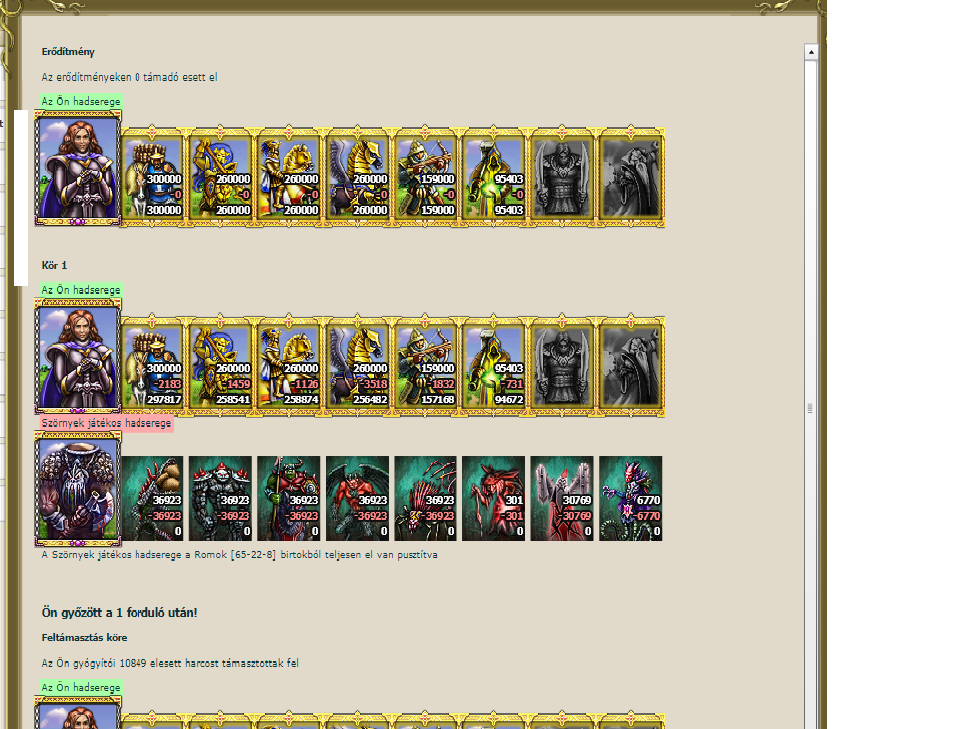 Egy álmosító júniusi hétfői nap után este éppen a kutatóim által aznap talált 5* és 6*-os ROM-ok helyét osztottam meg tábornokaimmal, amikor egy futár érkezett BlaALovag szövetségesemtől, hogy kutatói egy hatalmas szörny hordákkal teli 7*-os ROM-ra leltek a déli határvidéken. Nem akartunk hinni a füleinknek, ezért még egyszer megismételtettem eme hihetetlen hírt a futárral. Tábornokaim a hír hallatára felhördültek, de rajtam csak a nyugodtság jeleit látták. Gondolataim máris a csapatösszevonáson és a ROM mielőbbi likvidálásán jártak. Gyorsan futárt küldtem BlaALovaghoz, hogy seregét mozgósítsa, de sajnos azok messze vidéken irtották a szörnyek hordáit, így csupán egyik Polgármesterét tudta a csatába küldeni velem. A sereg gyorsan összeállt, eközben látnokaink folyamatosan munkában voltak, hogy más nagyurak nem fedezik e fel a szörnyek rejtekhelyét. Szerencsére minden csendes volt, az indulásig nem fedte fel senki más a 7*-os ROM helyét. Ekkor BlaALovag futára ismételten megérkezett a hírrel, hogy vezére megindult a szörnyek irányába. Ennek tudatában parancsot adtam a seregnek, hogy csatlakozzanak szövetségesem vezéréhez, hogy együtt pusztítsuk el ezt a félelmetes szörny sereget. A feladatunk nehezítette, hogy Ilfed, a Szörnyek 44-es szintű vezére nem hagyta el a búvóhelyüket, így nagyban erősítette a szörnyhad erejét. Az idő lassan telt, ameddig a sereg lassan, de biztosan a célja felé haladt. Kémeink, látnokaink folyamatosan kémkedték, látnokolták a ROM-ot, de az idő teltével szerencsére semmi változást nem tapasztaltak. Valamivel este 8 óra után megütköztünk a bestiákkal és vezérükkel a ROM-ban található mérhetetlen mennyiségű Fekete igazgyöngyért, Kristályokért és Varázstárgyért. A csata csupán 1 órán át tartott, mert váratlan támadásunk és hatalmas erőfölényünk ellenfeleink félelmetes seregét lemosta a csatatérről. Hordáraink és vezéreink felkutatták, összeszedték a temérdek mennyiségű Fekete igazgyöngyöt, zöld, sárga és lila kristályokat, varázstárgyat, valamint a szép mennyiségű nyersanyagot és a birodalom lakosságának egész úton át tartó üdvrivalgása közepette tette meg a várainkig hátralévő utat. Akkorra már minden a birodalomban élő uralkodó értesült hőstettünkről, melyet néhányan irigykedéssel, néhányan elismeréssel jutalmaztak. Ez a nap örökké emlékezetes lesz, hiszen ilyen hőstettet kevesen hajtottak végre ebben a birodalomban.